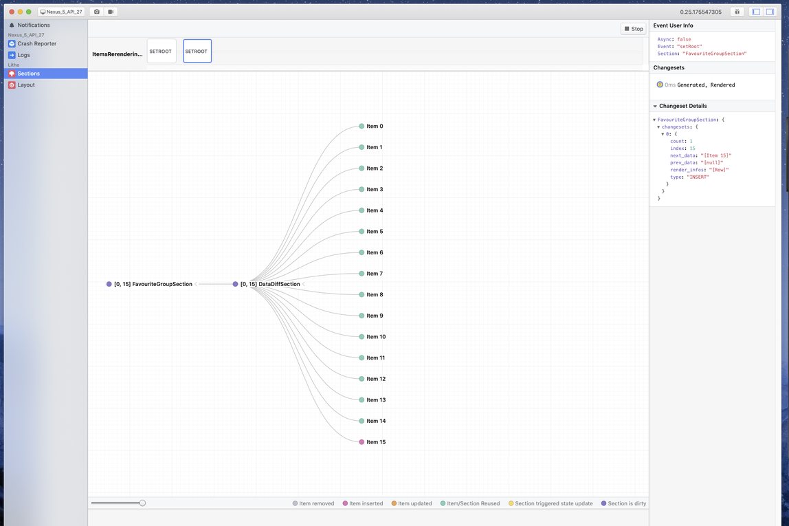 The resulting updated list has 20 items, but the Changeset doesn’t have any DELETE operations. This raises the question of what happened to the items that were initially inserted, which indicates that something out of the ordinary is going on with the items the RecyclerBinder knows about. The RecyclerBinder has no knowledge about the items which were inserted on the first render, and that can only mean one thing: a new RecyclerBinder instance was created after the second setRoot. This can happen if the RecyclerCollectionComponent’s state is recreated. You can confirm by adding logging in its @OnCreateInitialState implementation. This means its key is changing after the setRoot update.