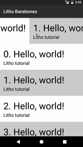 Recall in the litho tutorial that we left off with a vertically scrolling list with alternating background colors. In this optional part of this tutorial, we will add an horizontal scrolling unit at the top of the list by modifying ListSectionSpec to leverage the composability of the Litho and Sections API.