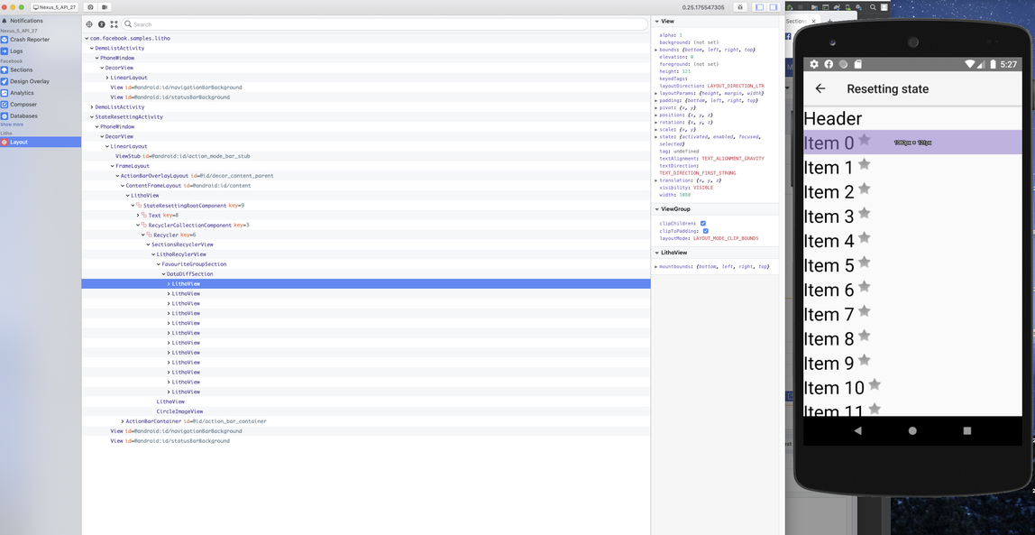 The resulting updated list has 20 items, but the Changeset doesn’t have any DELETE operations. This raises the question of what happened to the items that were initially inserted, which indicates that something out of the ordinary is going on with the items the RecyclerBinder knows about. The RecyclerBinder has no knowledge about the items which were inserted on the first render, and that can only mean one thing: a new RecyclerBinder instance was created after the second setRoot. This can happen if the RecyclerCollectionComponent’s state is recreated. You can confirm by adding logging in its @OnCreateInitialState implementation. This means its key is changing after the setRoot update.
