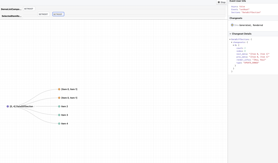 Here you see that when you pass a new value for selectedItem and setRoot is called, the changeset generated for this shows us that all items in the list have been reused and nothing got updated. This is not what is expected: items 0 and 1 should be updated.